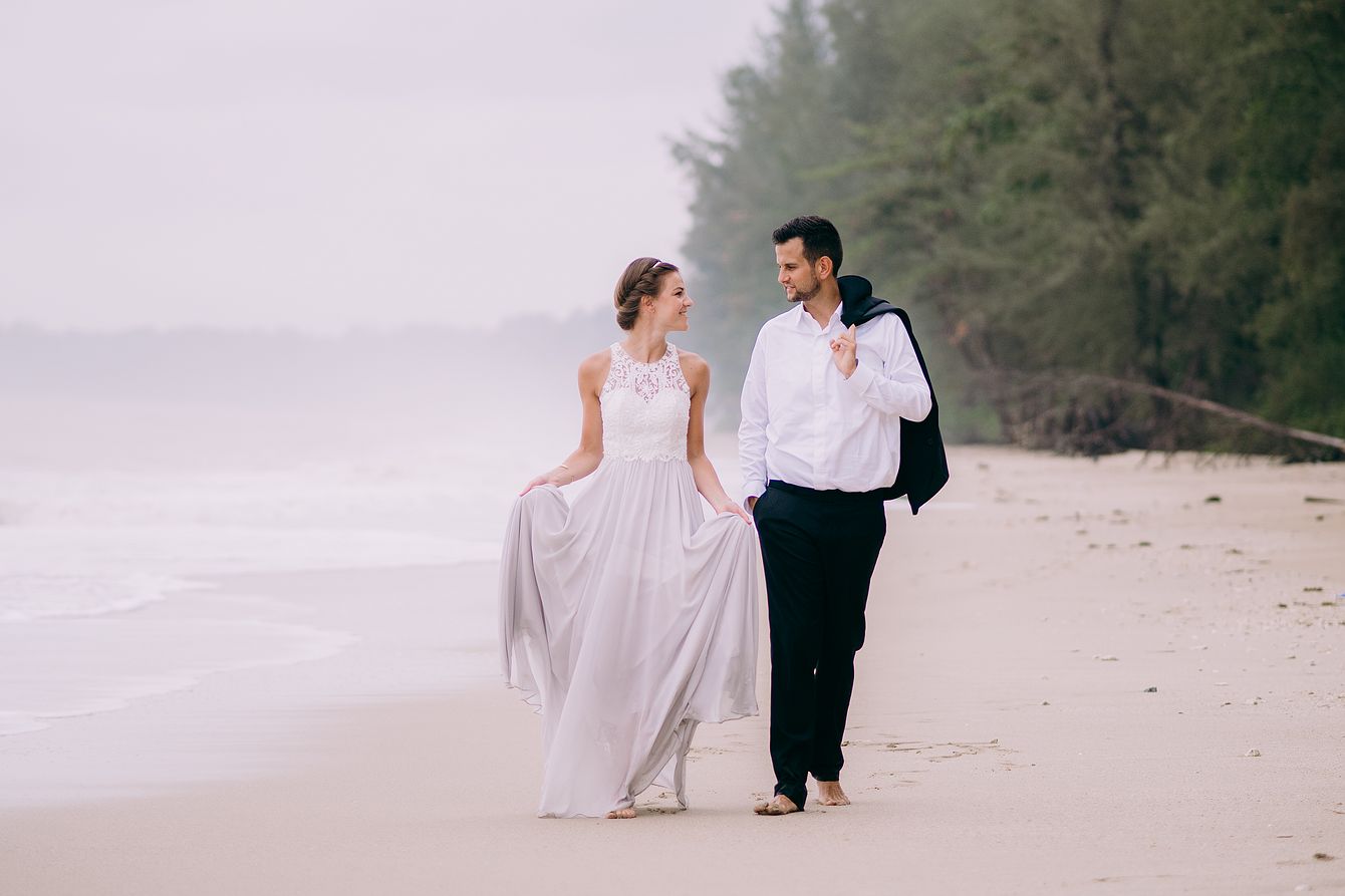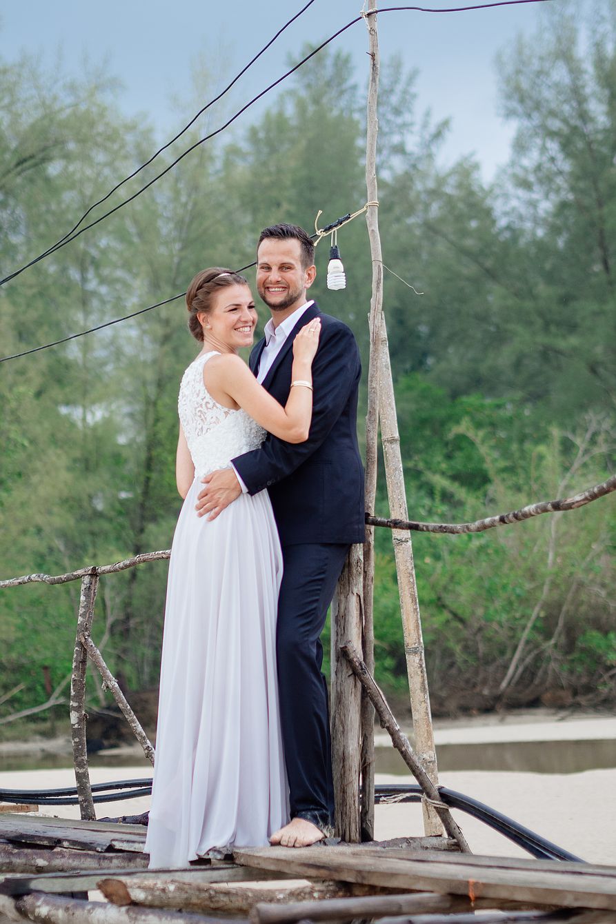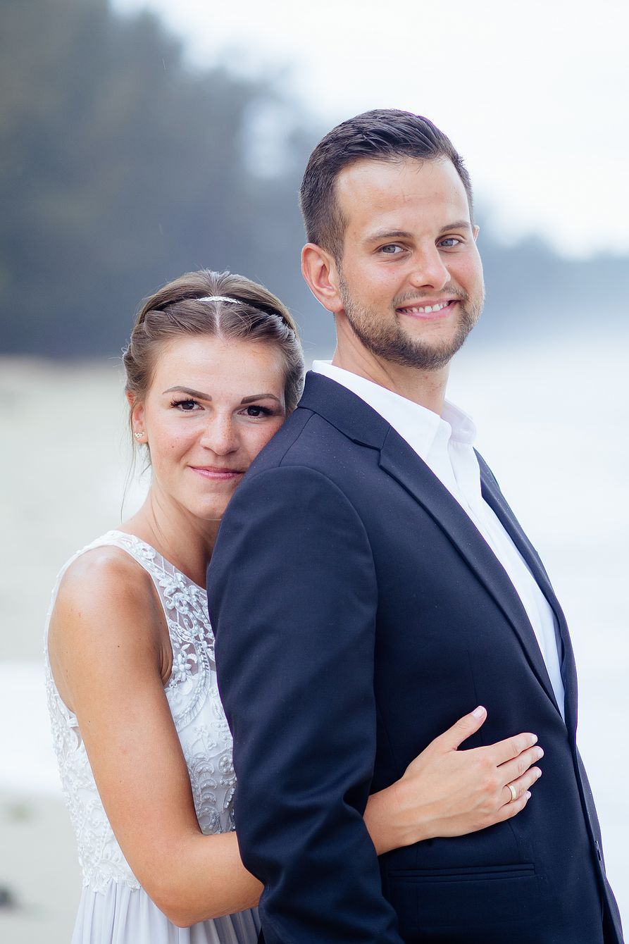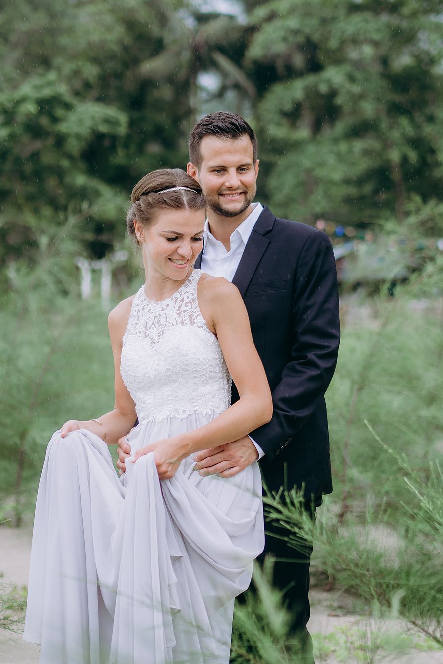 We once again had the pleasure of returning to our old home away from home in Khao Lak, where we had lived just across from the Beyond Resort for almost two years. It was a true delight to accompany this wonderful couple during their honeymoon at the same resort, capturing their special moments with our cameras. Of course, they had brought their wedding attire with them, and we met this stunning couple early in the morning to begin the photoshoot. A light drizzle started right at the beginning of the session and stayed with us throughout the day. As a photographer, however, I found that the soft, diffused light created by the weather was perfect for capturing flattering, romantic images.