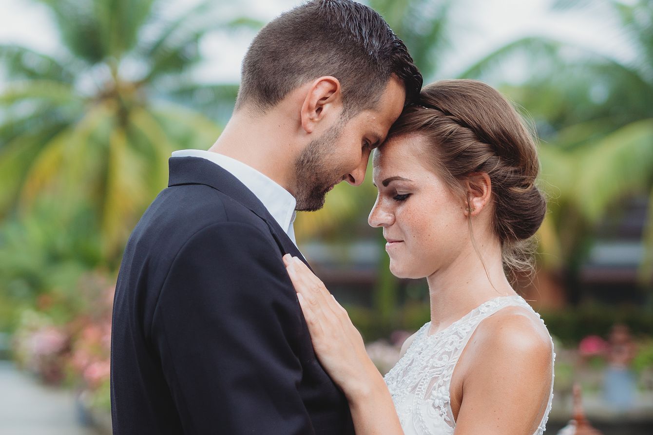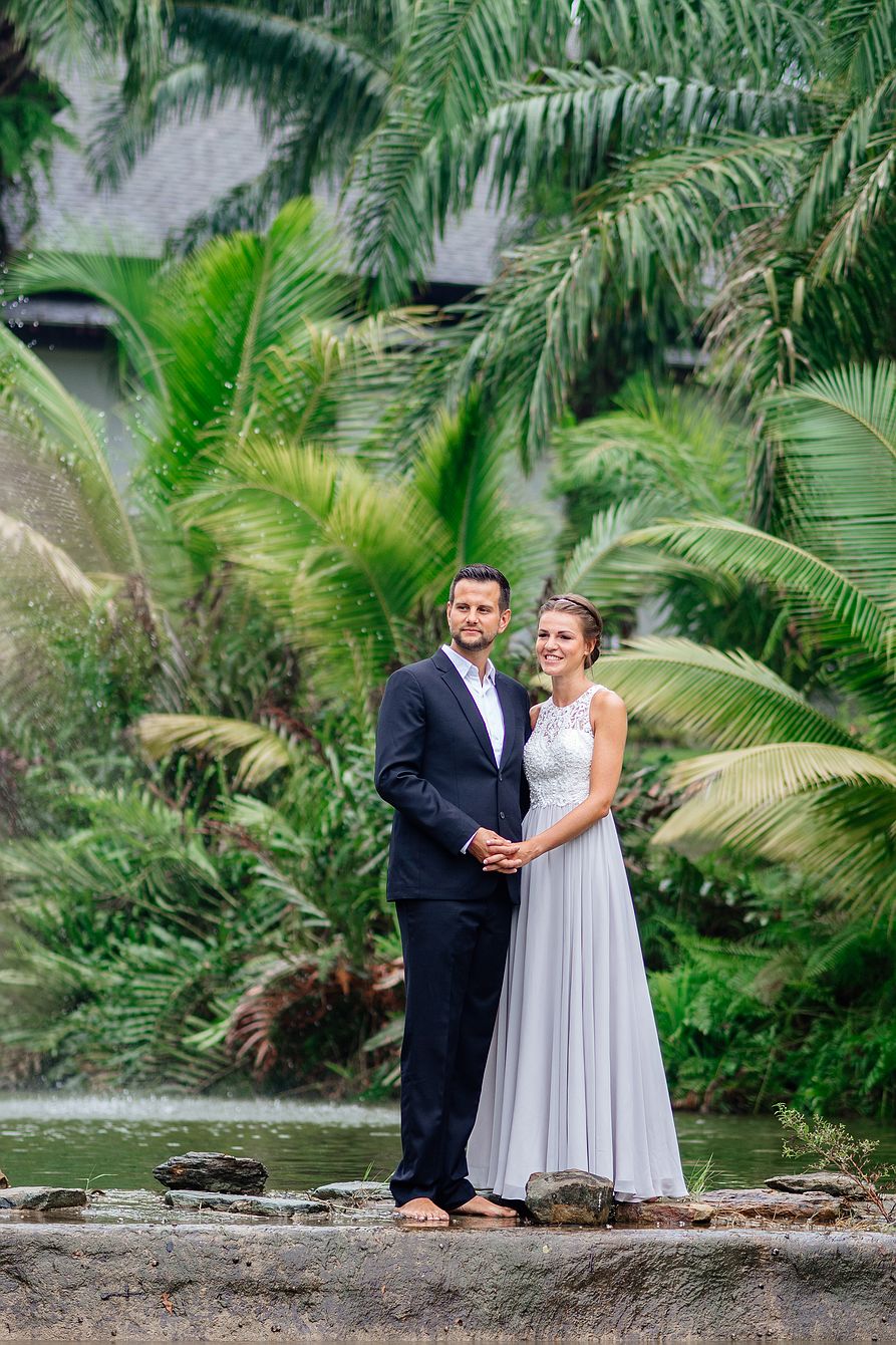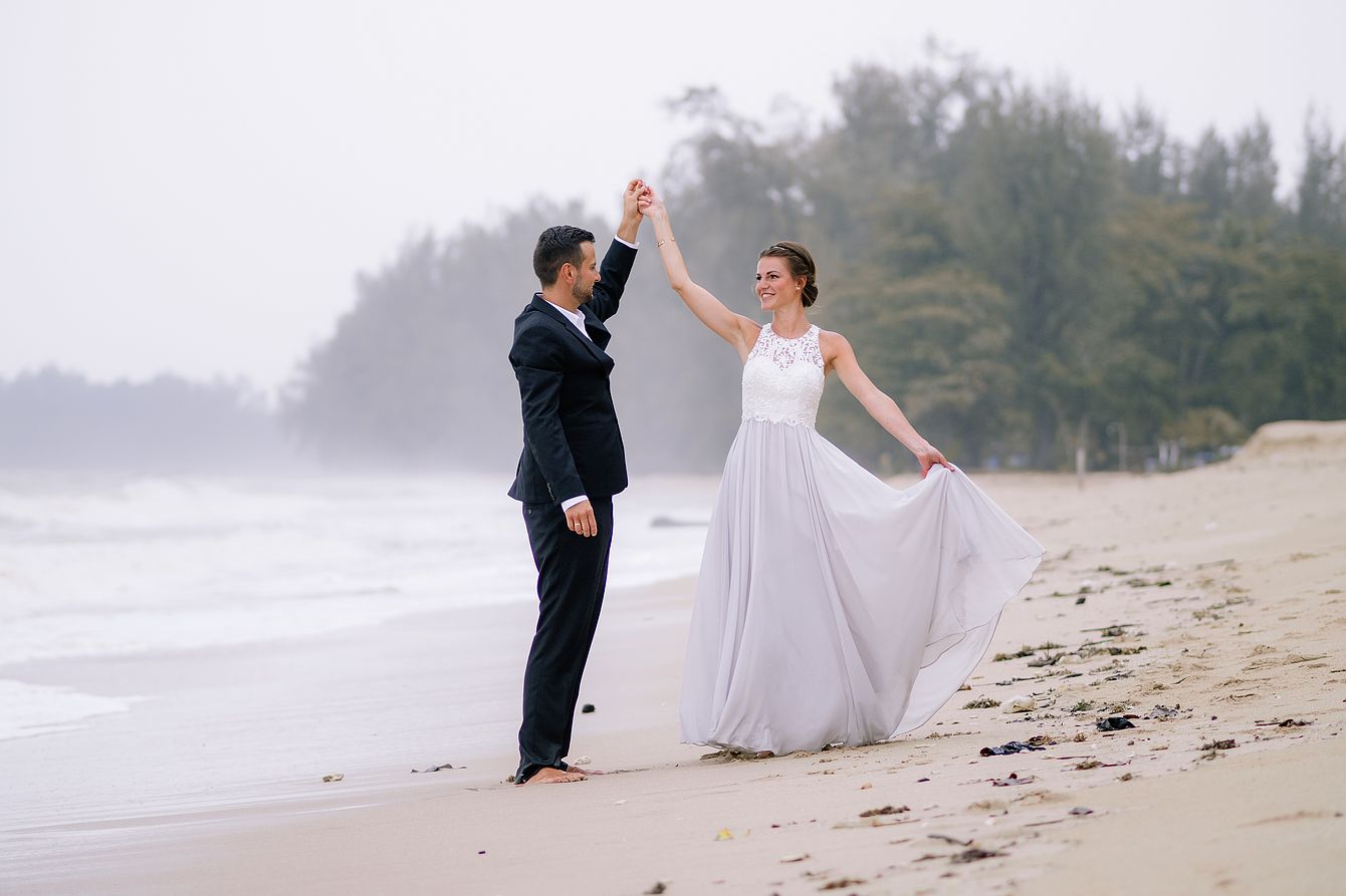 We once again had the pleasure of returning to our old home away from home in Khao Lak, where we had lived just across from the Beyond Resort for almost two years. It was a true delight to accompany this wonderful couple during their honeymoon at the same resort, capturing their special moments with our cameras. Of course, they had brought their wedding attire with them, and we met this stunning couple early in the morning to begin the photoshoot. A light drizzle started right at the beginning of the session and stayed with us throughout the day. As a photographer, however, I found that the soft, diffused light created by the weather was perfect for capturing flattering, romantic images.