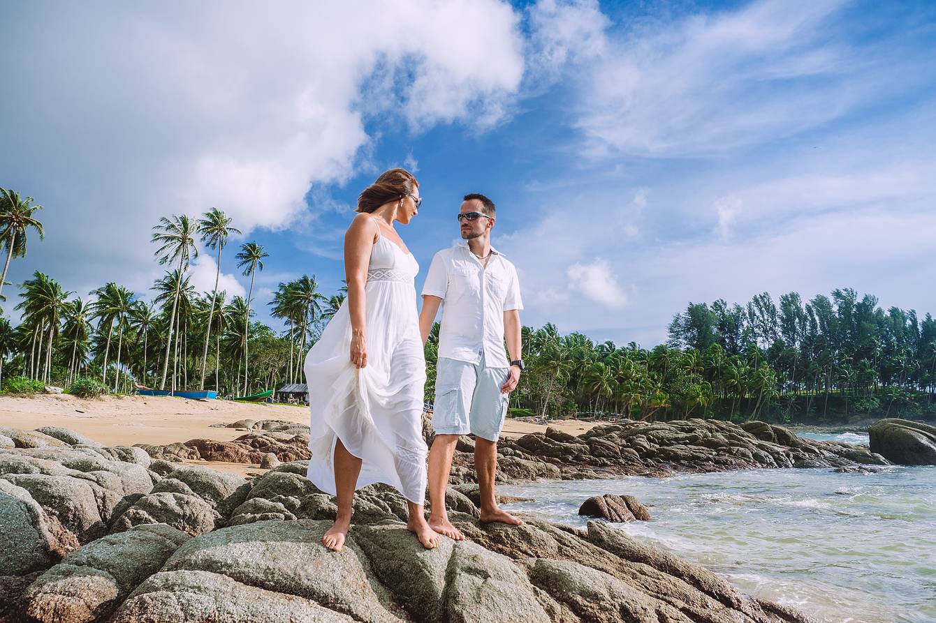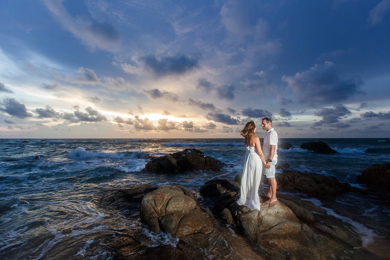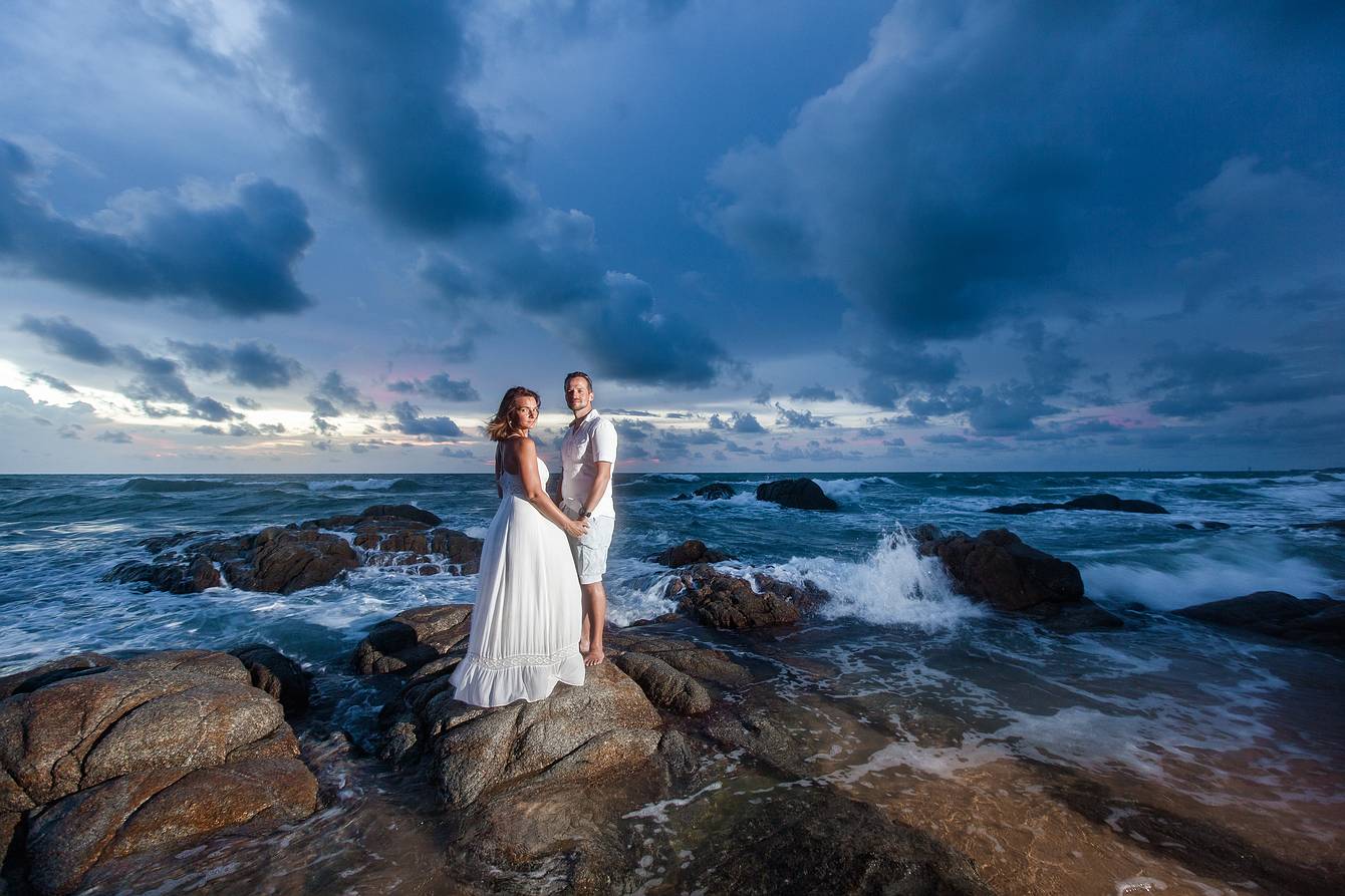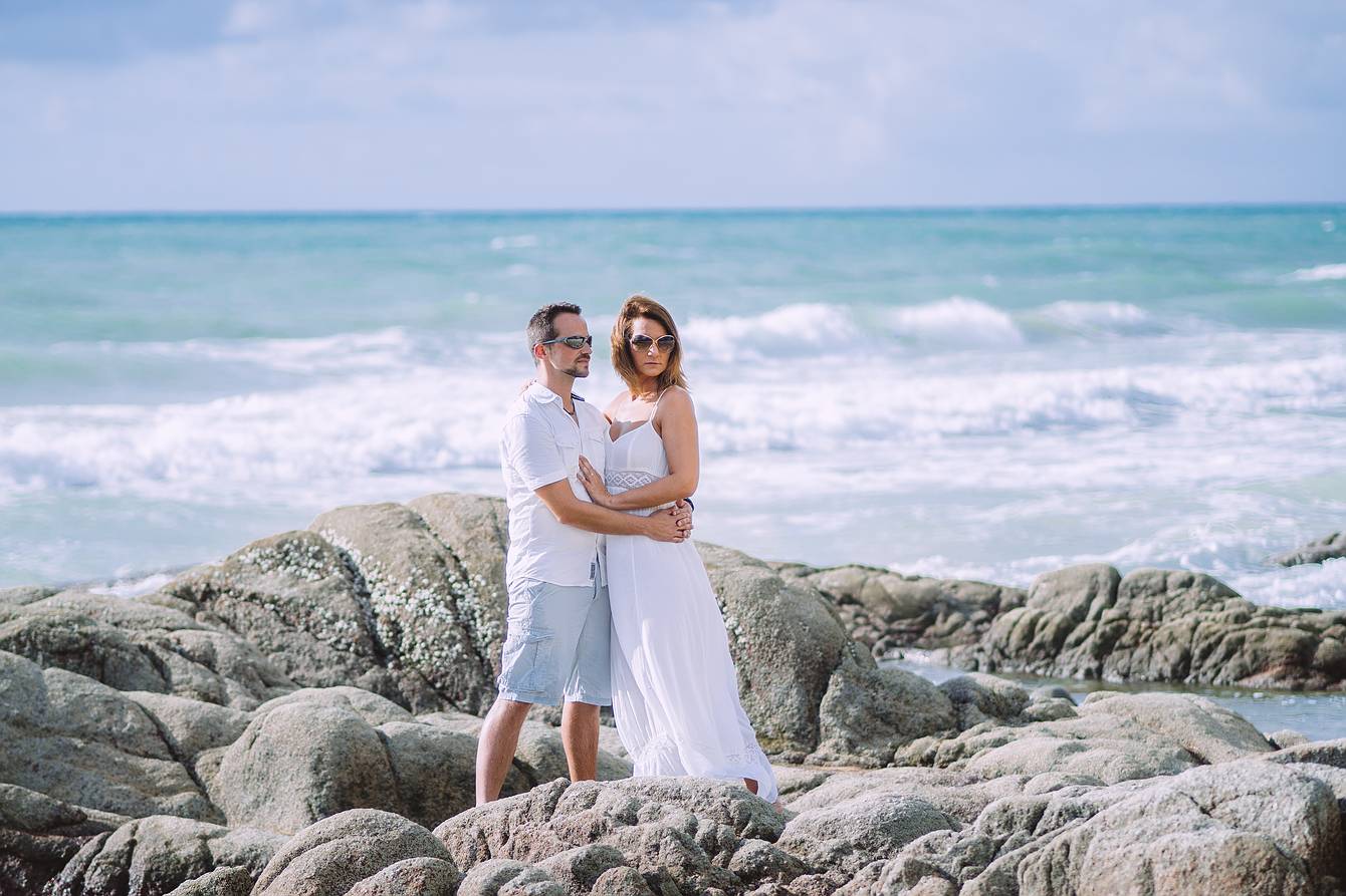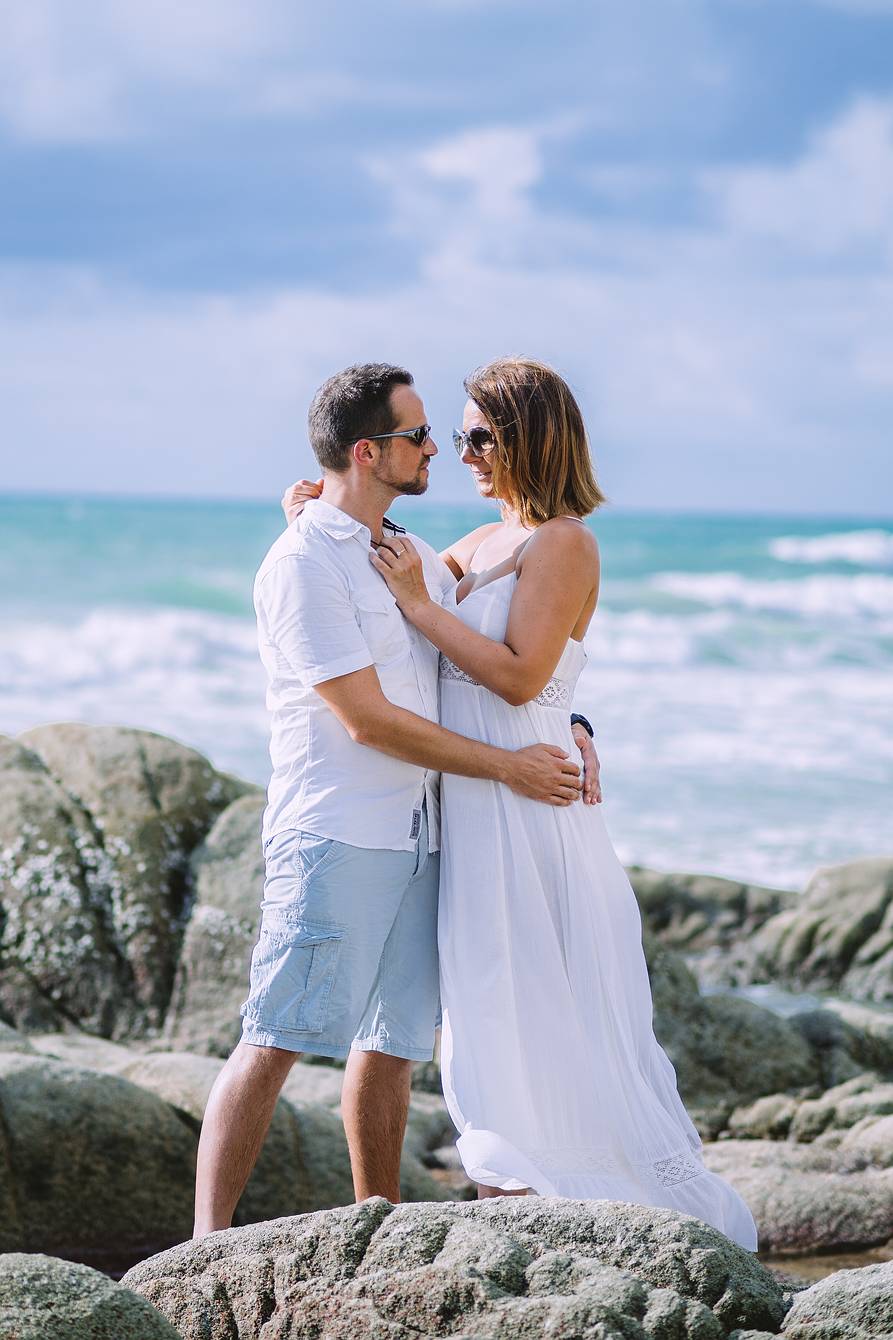 Later, we drove to a beach section about two kilometers away, where small rock formations created a spectacular natural backdrop—ideal for the next part of our photoshoot. Every moment captured here reflects the elegance, romance, and tropical beauty of Phuket, making it an unforgettable experience for both the couple and our cameras.