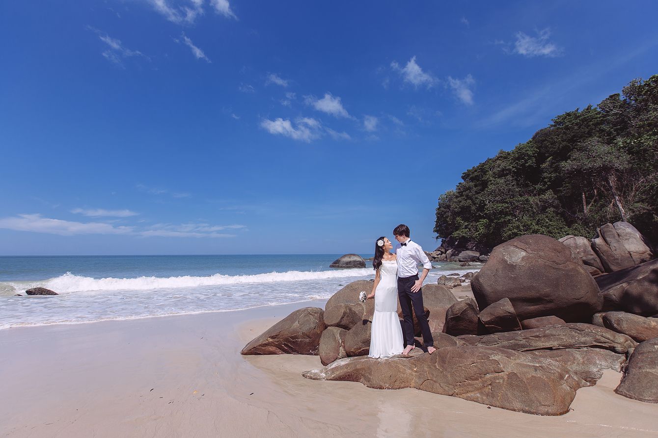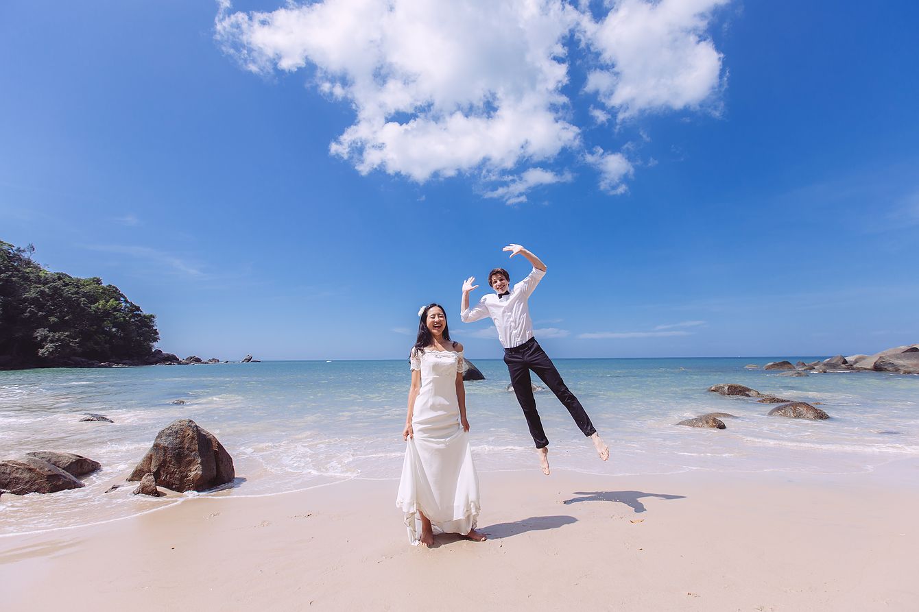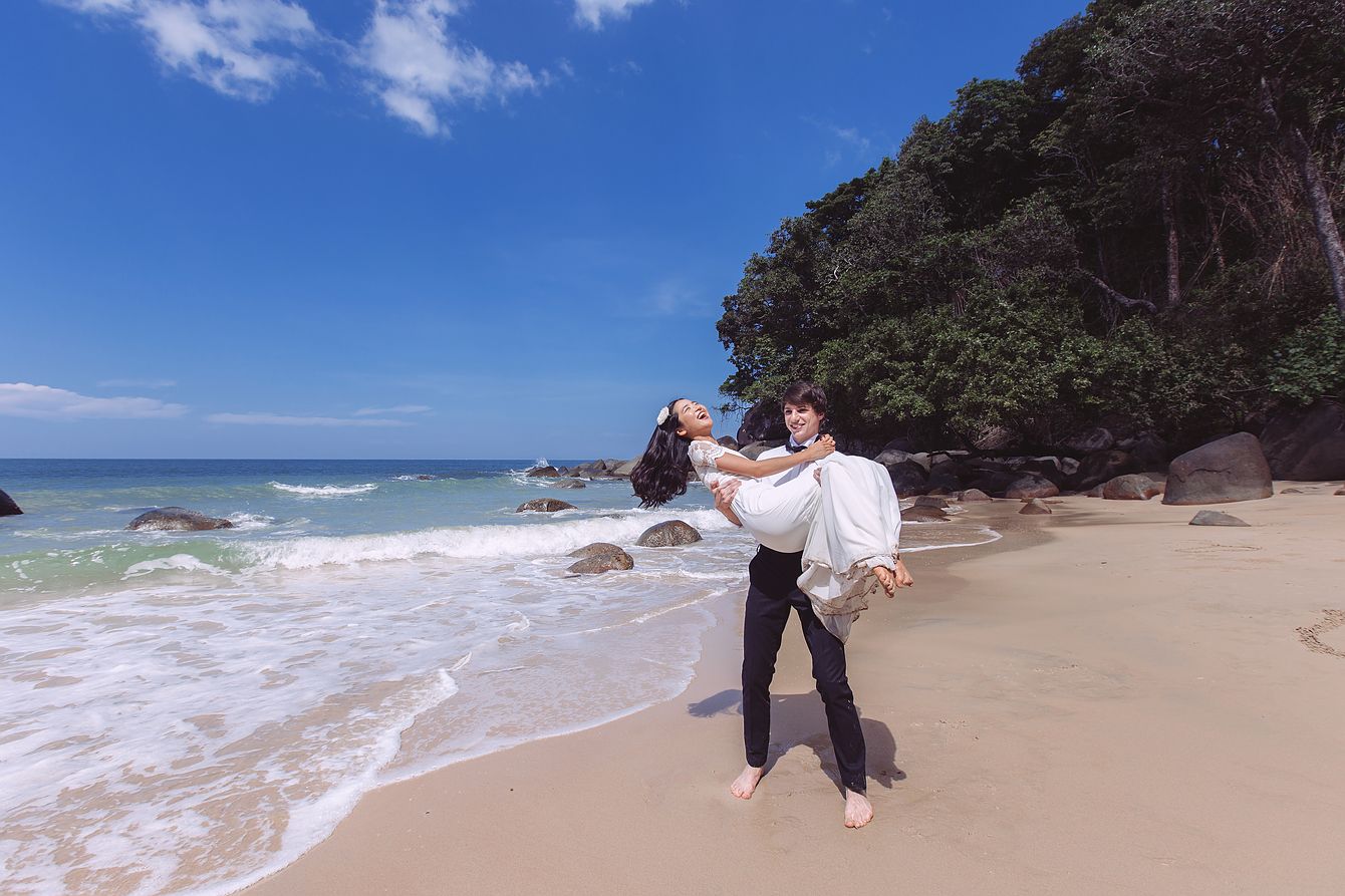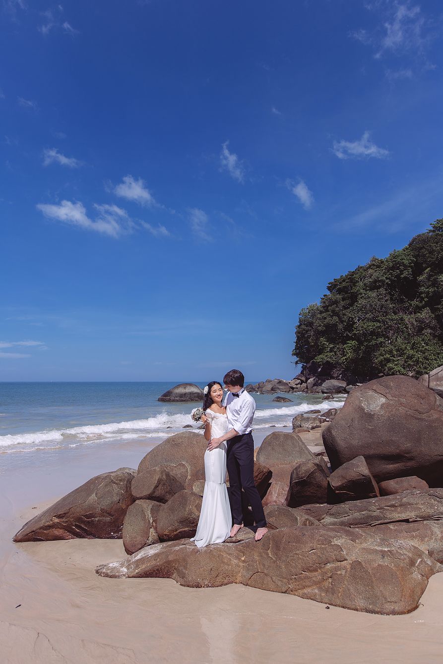 We returned once again to Small Sand Beach, one of the most stunning locations in Khao Lak, to photograph a wonderfully charming young couple from Japan. With the sun shining brilliantly, endless blue skies, and crystal-clear water framed by striking rock formations, this beach is truly a photographer’s paradise. Its serene atmosphere and natural beauty make it the perfect backdrop for capturing romantic and unforgettable moments.