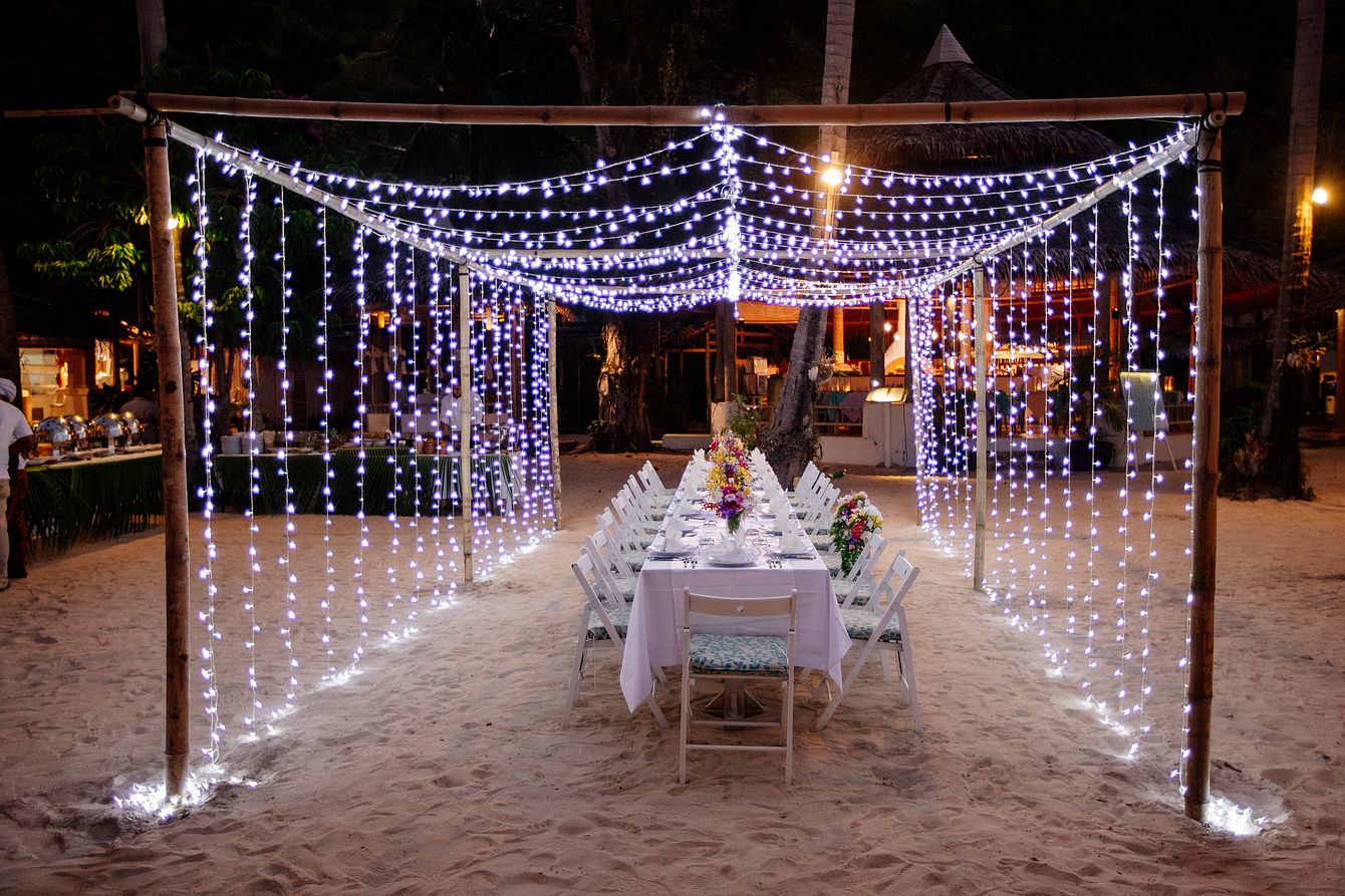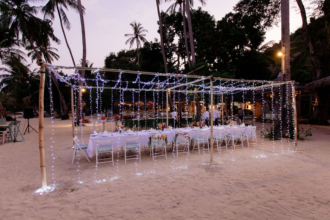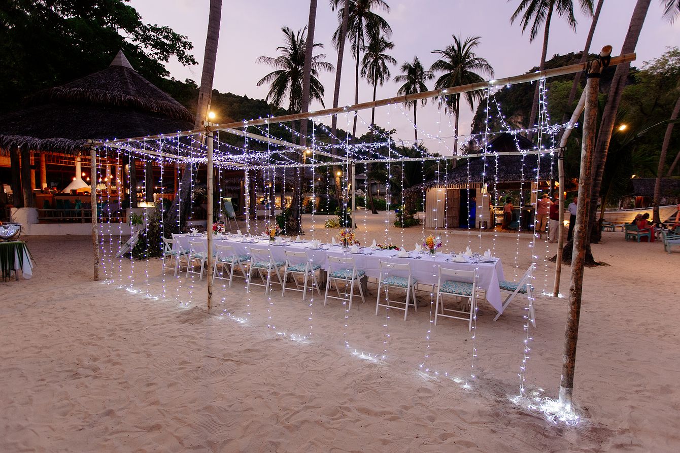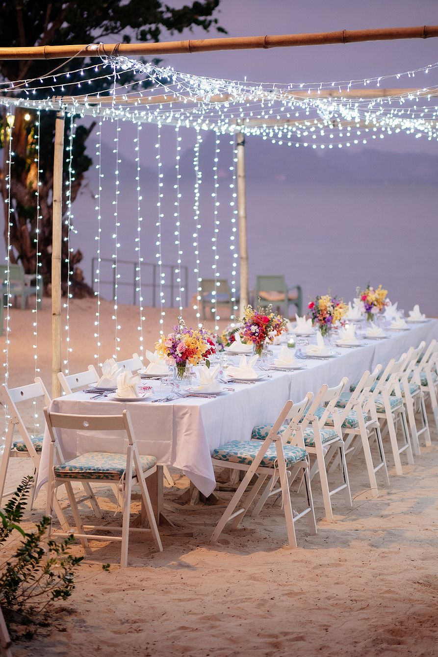 For their ceremony, the couple selected a vibrant tropical floral arrangement with crisp white wooden chairs set up directly on the beach. A refreshing lemonade bar and canapé buffet were arranged in front of the villa, creating a perfect prelude to the celebrations. Our video team from Phuket was also on hand to capture the day in moving images. The evening dinner featured a traditional Thai BBQ buffet, set along a long table beneath a magical fairylight tunnel and accompanied by live music from Mr. Tiger from Phuket.