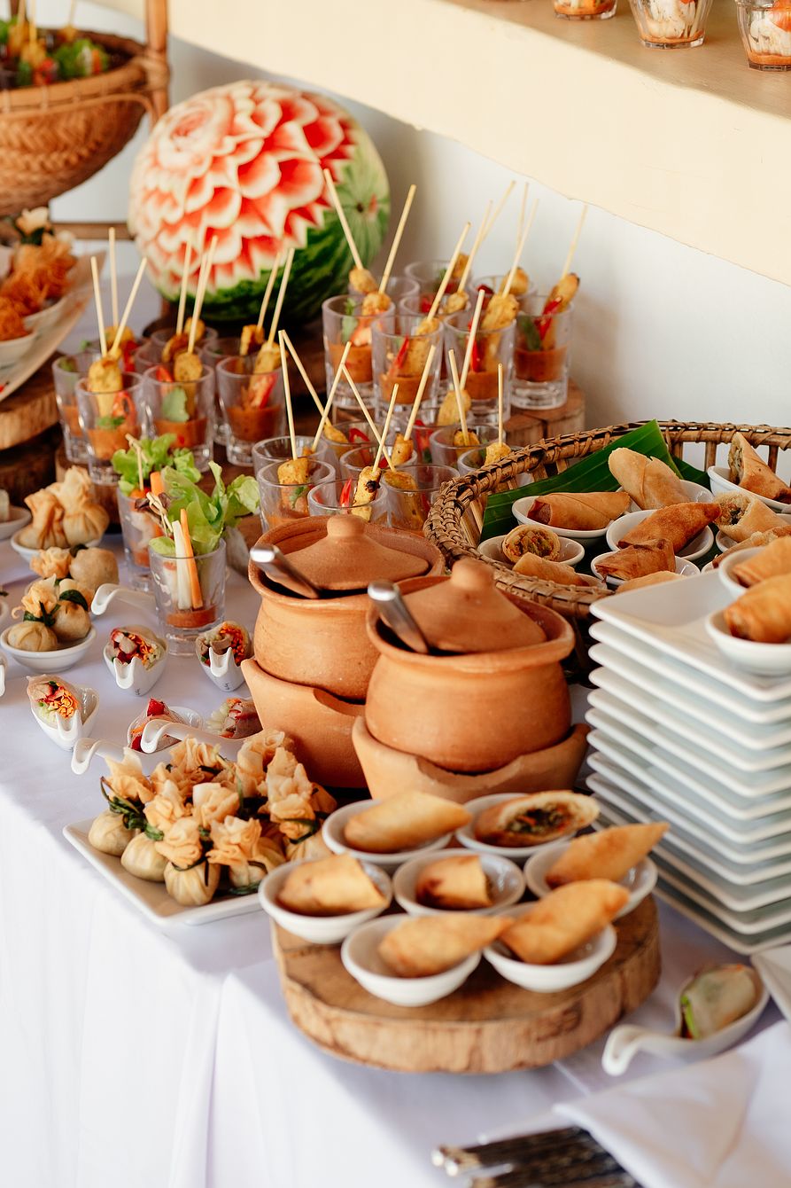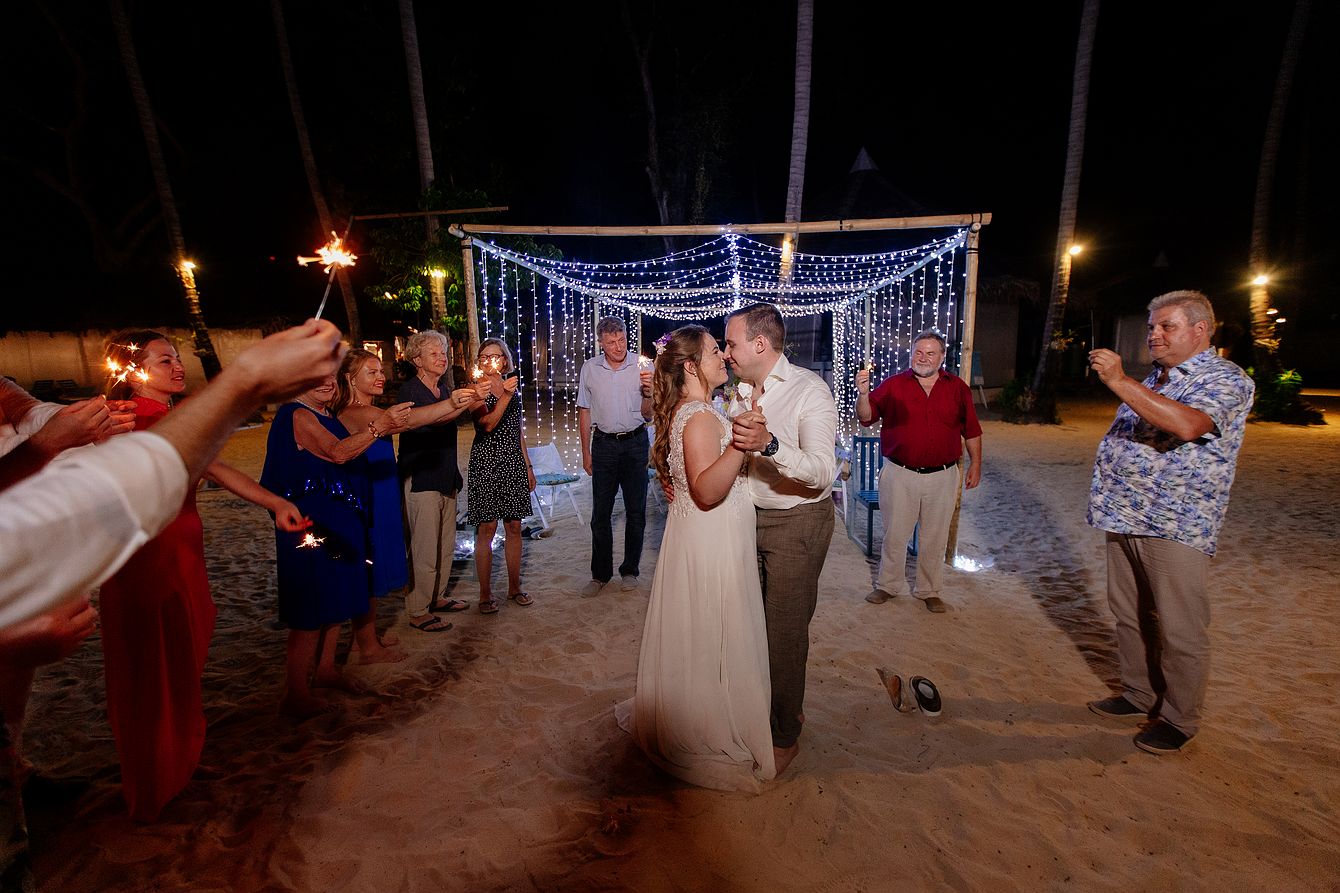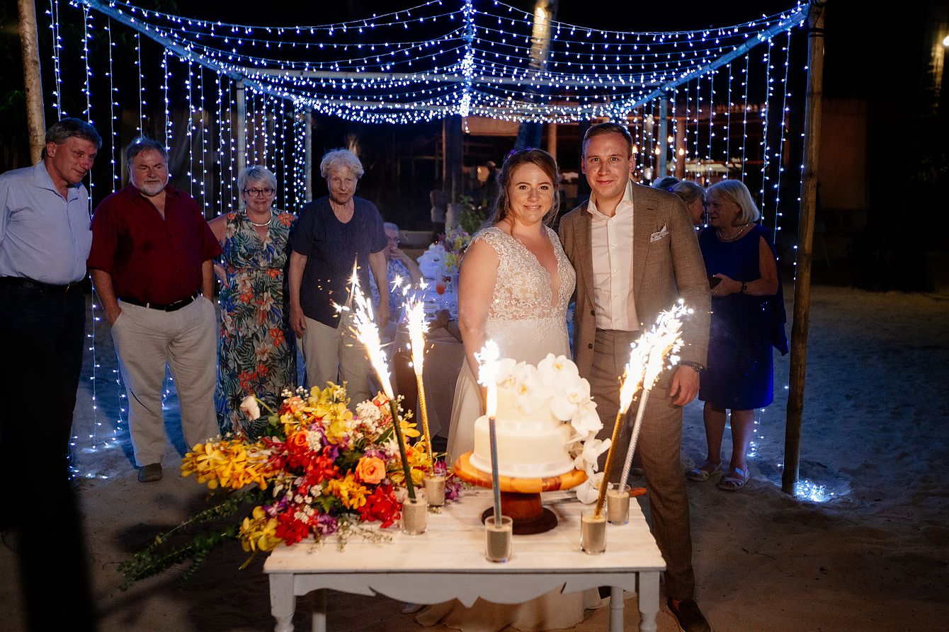 For their ceremony, the couple selected a vibrant tropical floral arrangement with crisp white wooden chairs set up directly on the beach. A refreshing lemonade bar and canapé buffet were arranged in front of the villa, creating a perfect prelude to the celebrations. Our video team from Phuket was also on hand to capture the day in moving images. The evening dinner featured a traditional Thai BBQ buffet, set along a long table beneath a magical fairylight tunnel and accompanied by live music from Mr. Tiger from Phuket.