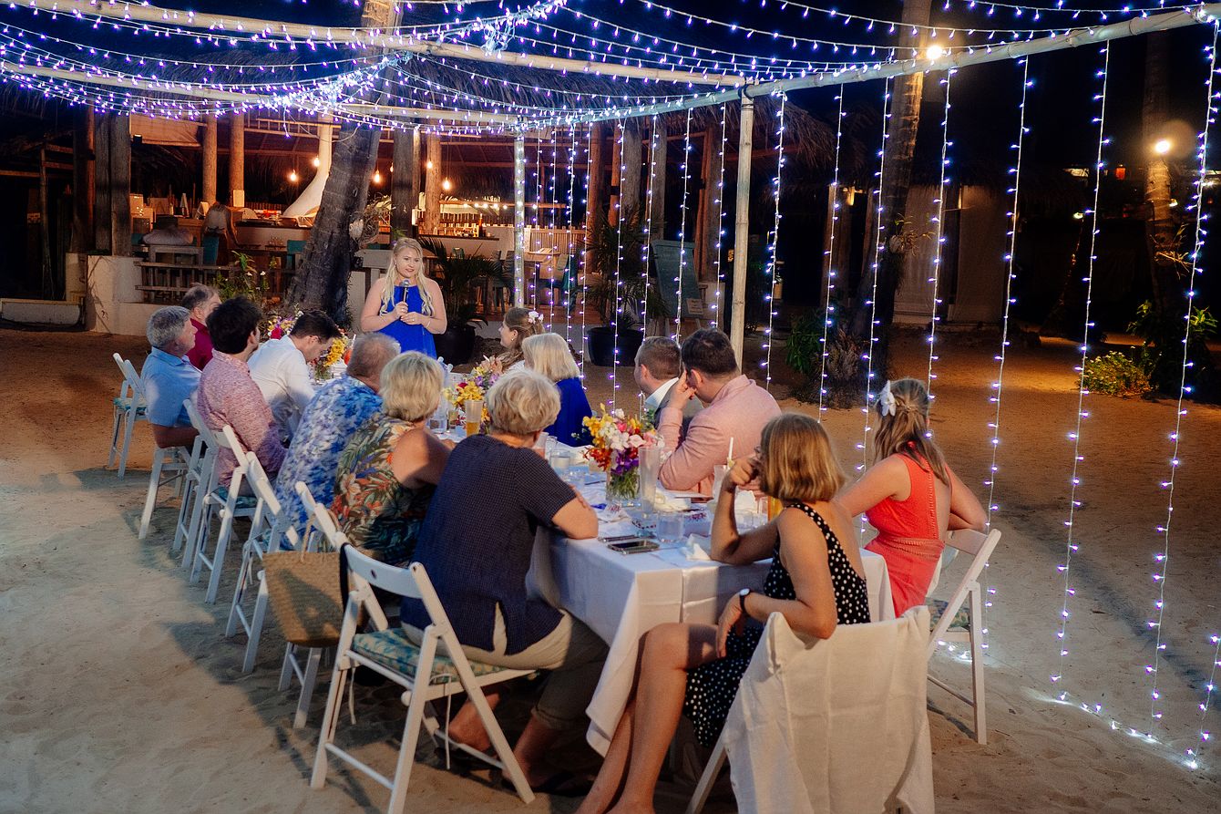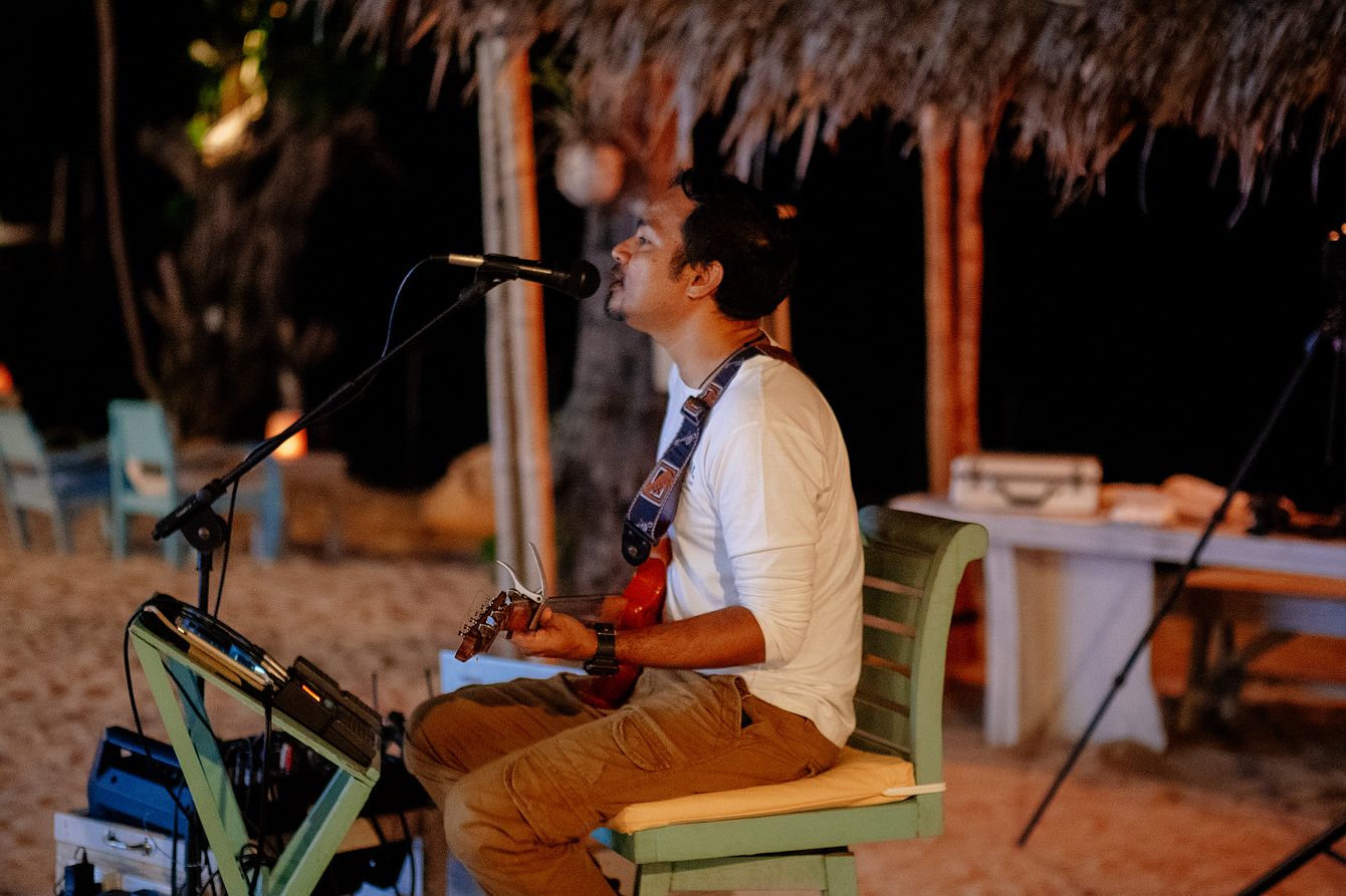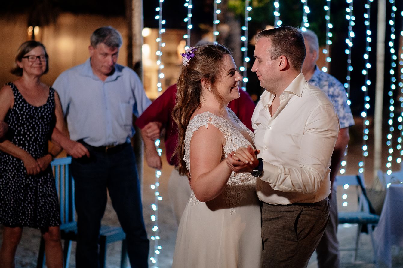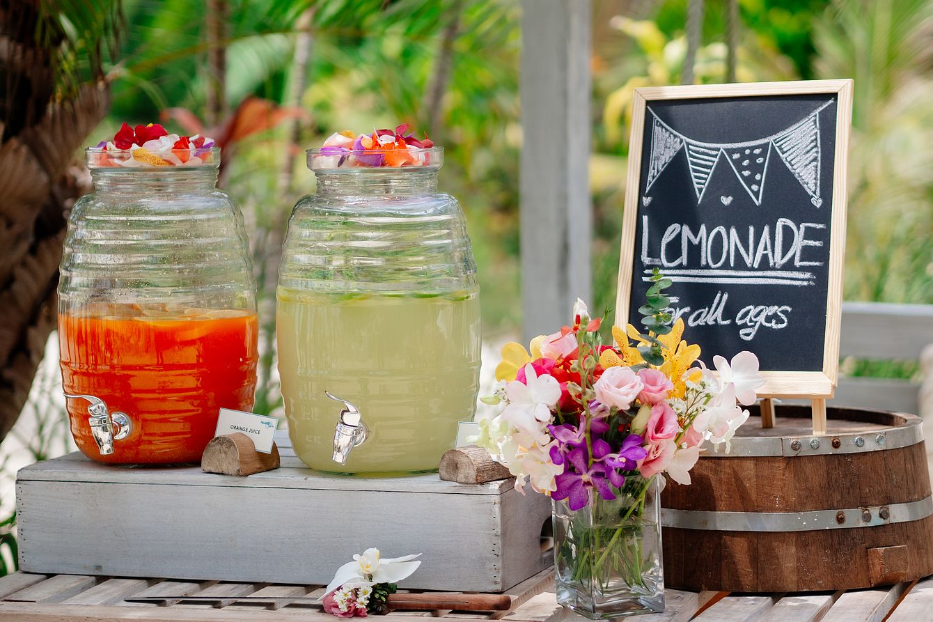 For their ceremony, the couple selected a vibrant tropical floral arrangement with crisp white wooden chairs set up directly on the beach. A refreshing lemonade bar and canapé buffet were arranged in front of the villa, creating a perfect prelude to the celebrations. Our video team from Phuket was also on hand to capture the day in moving images. The evening dinner featured a traditional Thai BBQ buffet, set along a long table beneath a magical fairylight tunnel and accompanied by live music from Mr. Tiger from Phuket.