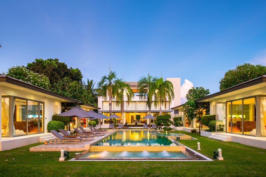 The central T-shaped pool, framed by the pavilion, the home theater, and six air-conditioned bedrooms, each with its own bathroom and individually decorated in three different styles, offer luxury and privacy for up to 12 guests. The main living area on the upper floor of the main pavilion integrates a TV lounge, dining room, and gourmet kitchen in an open-plan space with an open-air balcony that is ideal for entertaining. A carefully laid stone path leads to an impressive sunken pavilion by the pool, which serves as a gathering place for al fresco culinary highlights prepared by a personal Thai chef.