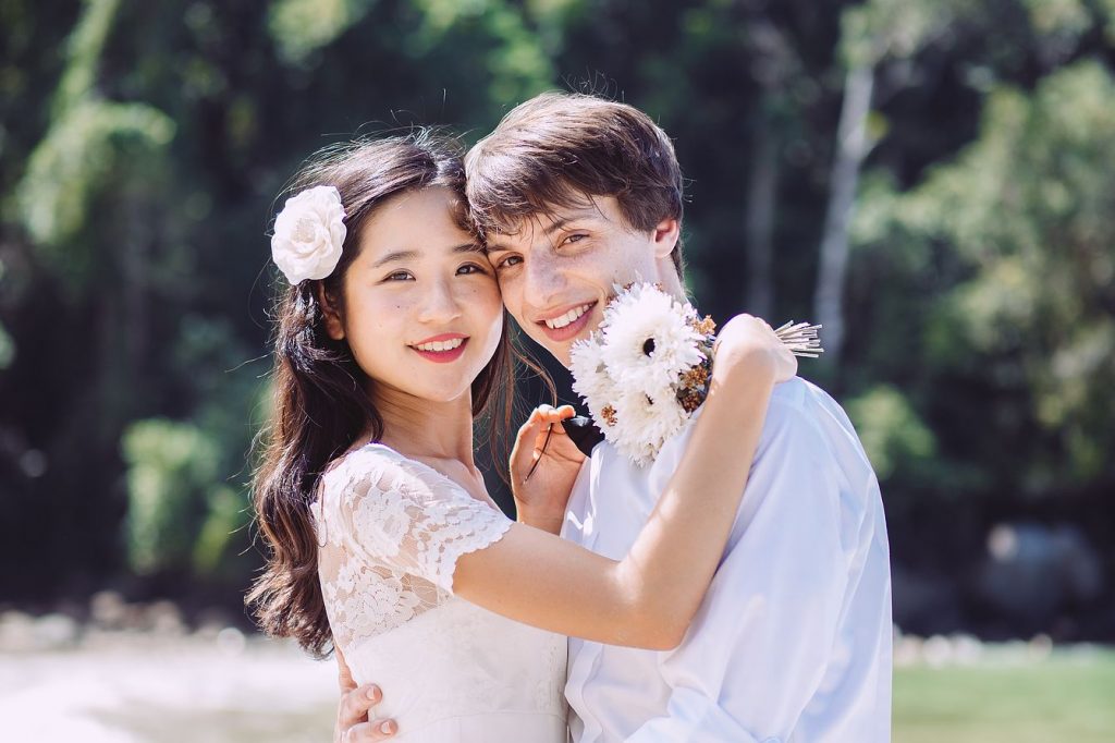 At Small Sand Beach in Khao Lak, we photographed this young, newlywed couple. They live together in Japan and had requested romantic beach wedding photos in addition to their ceremony. The weather couldn’t have been more perfect: clear blue skies, warm summer temperatures typical of Thailand, and an incredibly charming couple—all the ingredients for unforgettable moments in paradise.